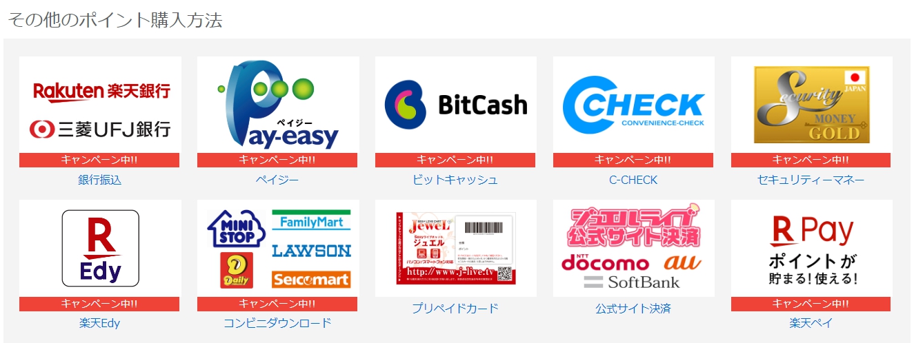 ●ジュエルライブチャットでは、下図のような10種類以上もの多彩な決済方法が用意されています。