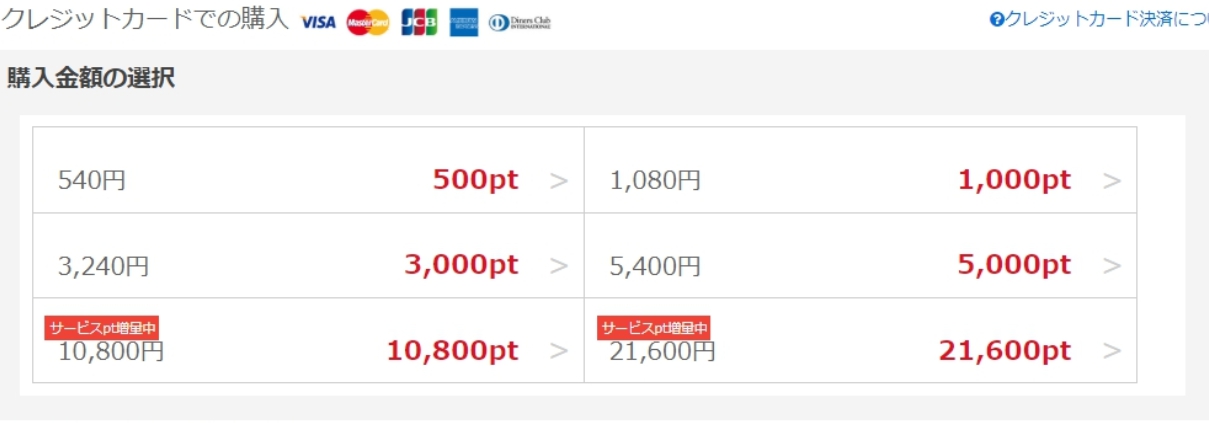 出来たら一番人気の5400円で8000ポイントが余裕があらば21600円で一番お得な30500ptあらばガッツリあそべます。